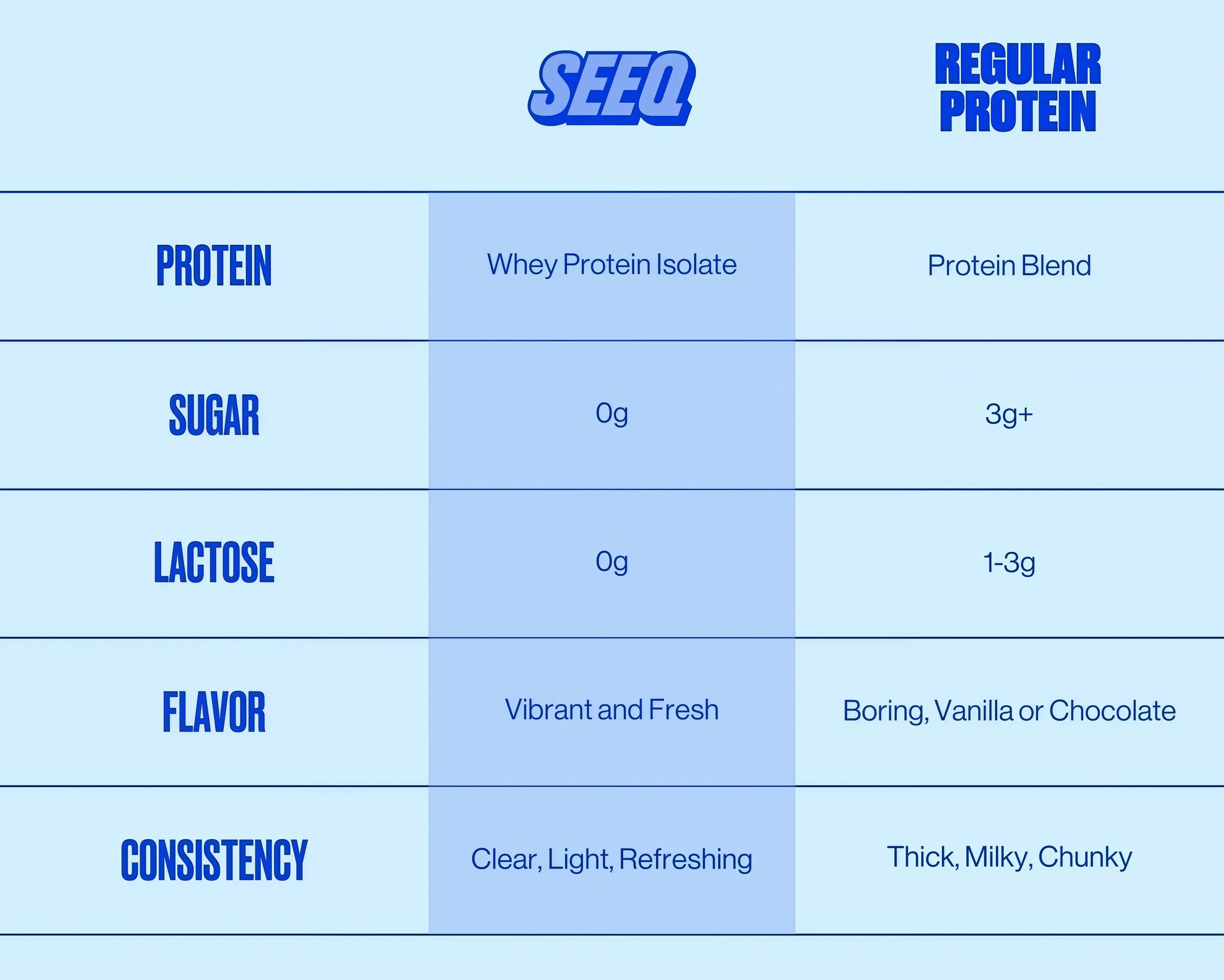 Traditional thick and milky protein shakes weren’t cutting it for us anymore, so we launched SEEQ Clear Protein: a light and refreshing protein that looks and tastes just like your favorite drink.